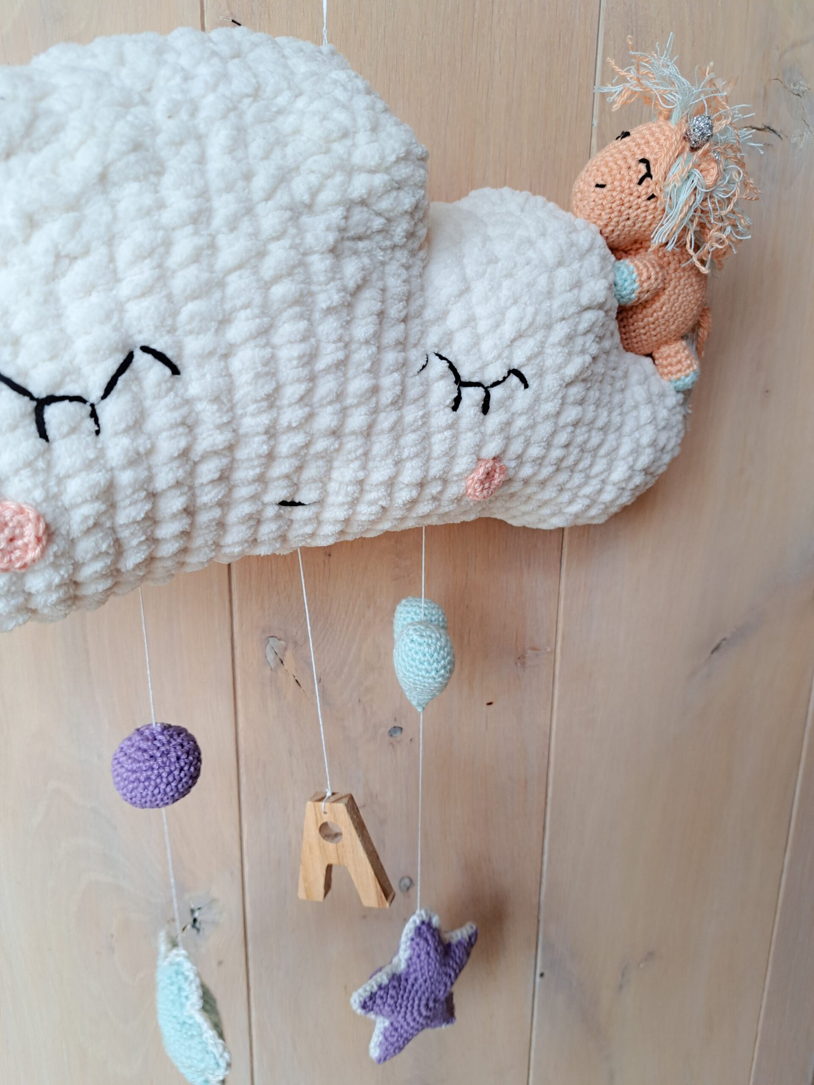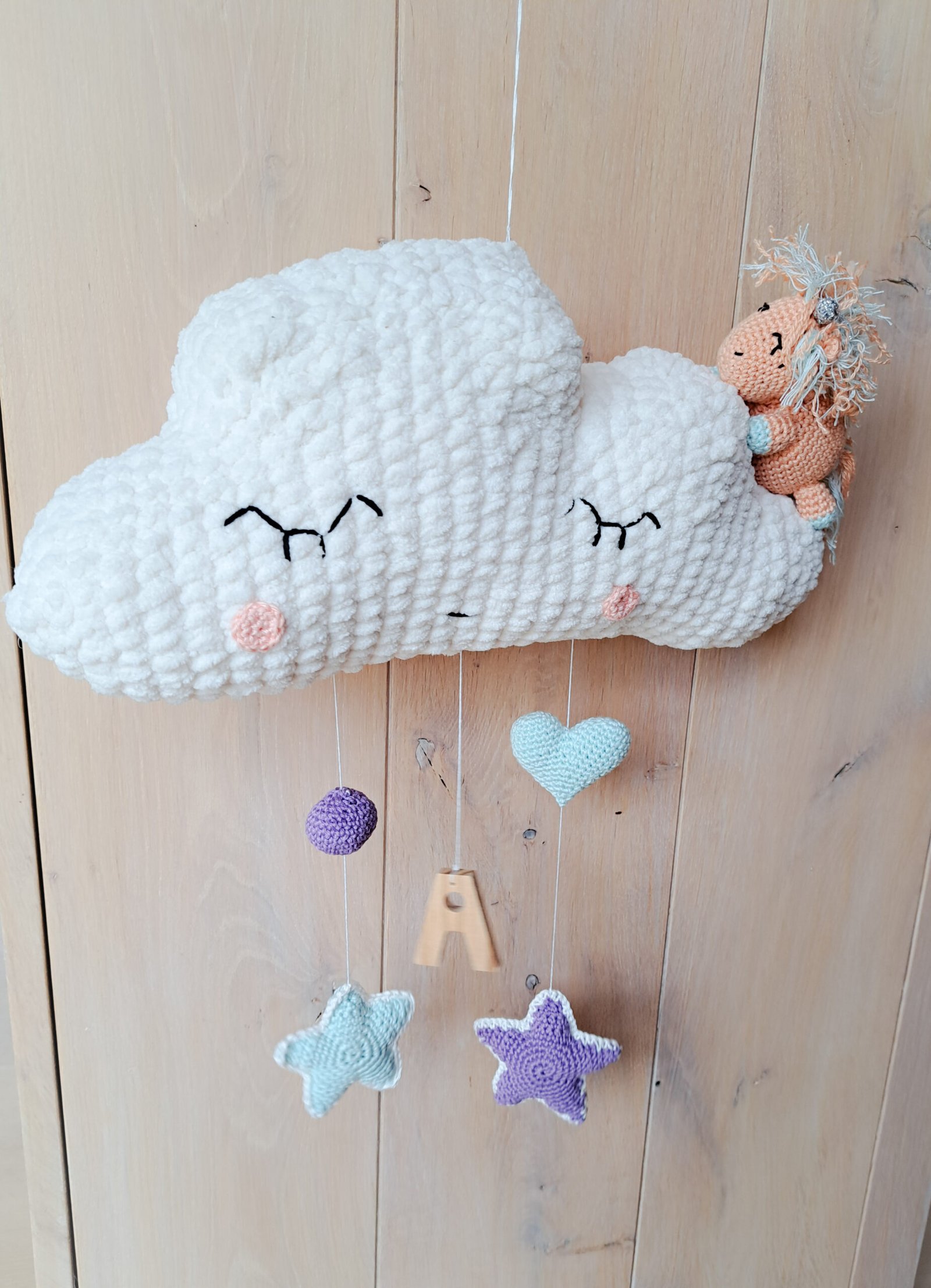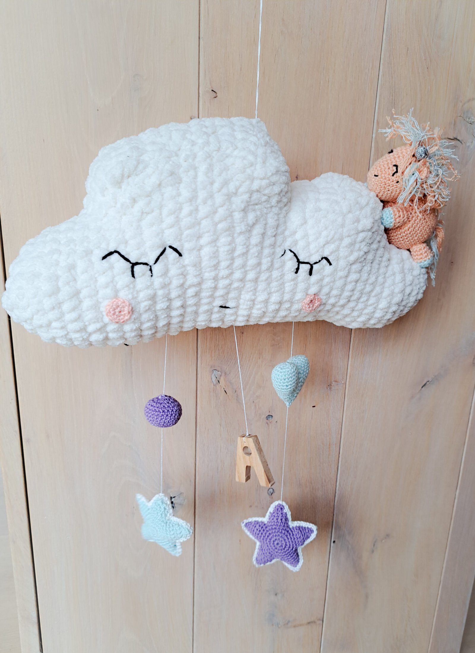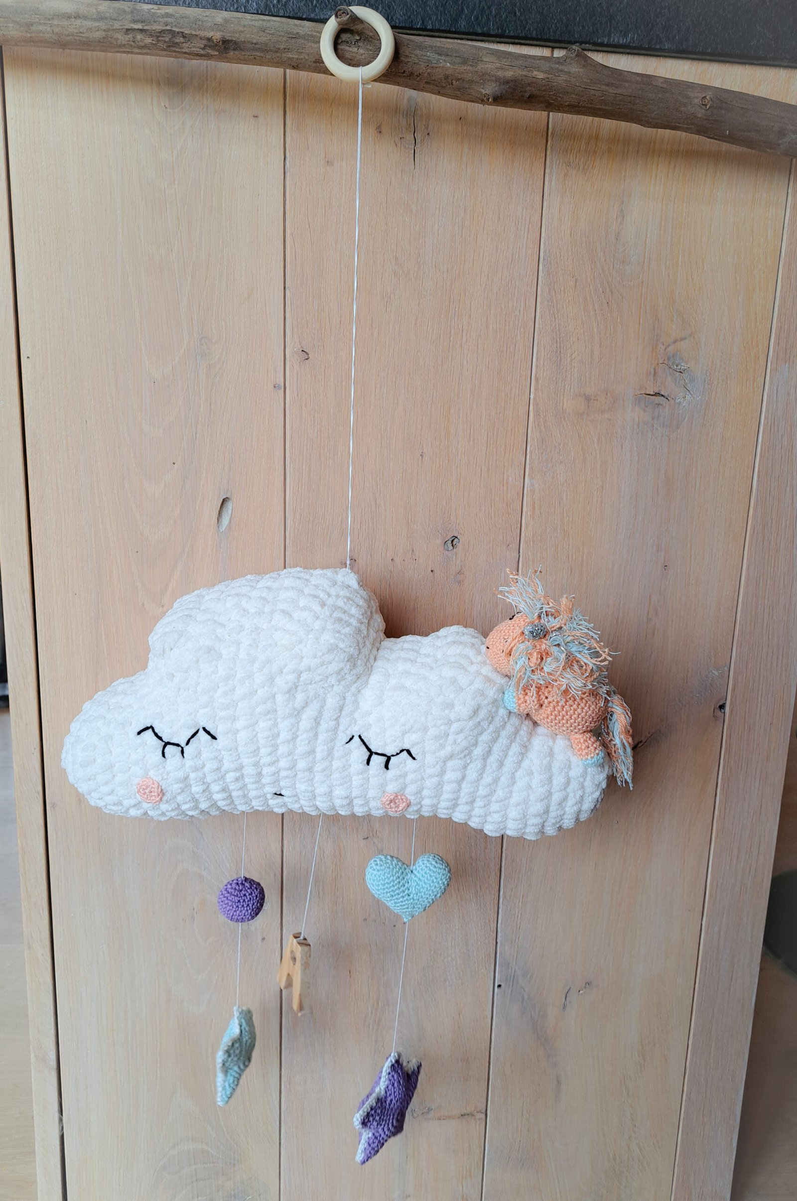 Wolkje met slapende eenhoorn, bol, hartje en sterren.